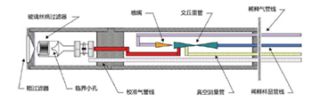 为保证恒定的稀释比,我公司的探头设计采用独特的音速小孔设计。当系统能够满足设定的最小真空度要求时,音速小孔两端的压差将大于0.46倍,此时通过音速小孔的气体流量将是恒定的,温度,压力的变化将不会影响稀释比。这就使得整个探头的流量控制是靠气动来完成的,因而无需任何专用电源和电路,具有体积小、安装简单、维护方便的特点。稀释系统保证的是稀释比的恒定,而并非给出一个确认的稀释比例。通过稀释比例的恒定,保证系统的准确性。